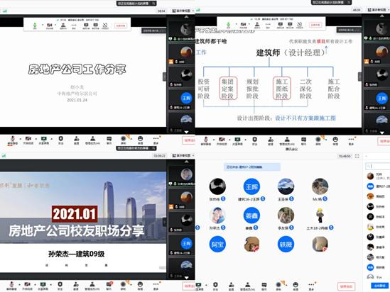 建筑工程学院于1月24日20时,在腾讯会议召开“筑梦在路上——房地产公司校友职场分享会”。本次分享会邀请到了来自中海地产、保利地产、金地地产公司的三位校友做分享。参加会议的有学院党委副书记周晓丽,建筑学专业王圣保教授,辅导员田家、张宏亮,建筑学专业学生。会议由2021届毕业生辅导员刘玥主持。
