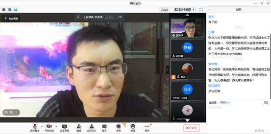 校友张英伟结合自己丰富的学习、工作经历,从建筑业的前景、职业规划、沟通交流等方面向同学们做了分享。他谈到目前土木工程专业在全国的就业率一直居于前列,有很好的就业前景。他强调要先认可专业,继而谋发展。职场是需要历练的,不要一味地挑剔当下,应将本专业学好的同时提升自我技能。并对同学们提出四点建议:一要注重细节。不管是在职场还是生活中,通过一件事就可以看出个人态度,如对时间的管理程度、对待工作的认真态度;二是抓住优势弥补劣势,找准差距弥补差距。不受地域限制,抓住双一流高校、历史沿革悠久的优势成功找到心仪的工作;三是做好职业规划、把握人脉资源、提升业务能力。初入职场,辛苦是必然的,能否持之以恒就是对大家的首份考验,没有闪光点就奋发努力;四是不要频繁跳槽。要做一个对企业忠诚、对学校信仰、有思想有理想的人。任何发展都不是一蹴而就的,坚信持之以恒就会胜利,机会都是留给有准备的人。最后,张英伟校友表达了对学校、学院各位老师多年培养的感谢,希望学弟学妹们无论未来选择哪种就业方式,都能够不忘初心,蓬勃发展,学业、事业如鱼得水。