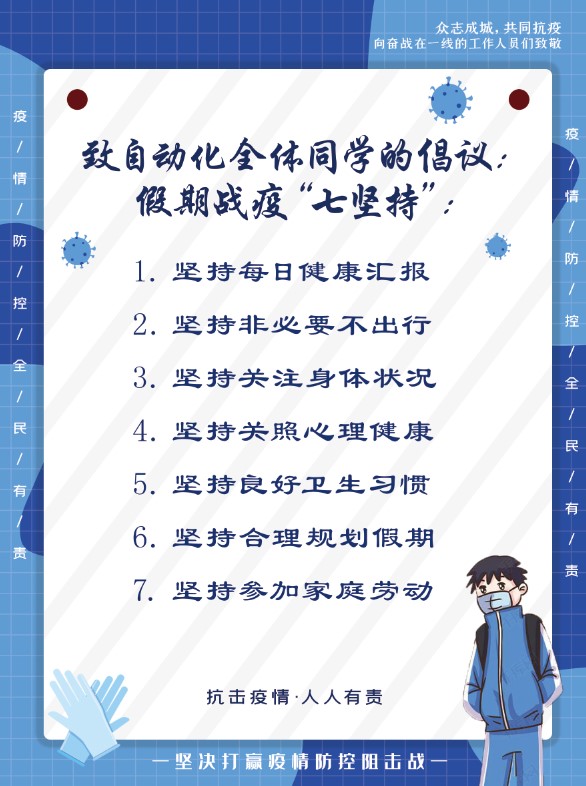近期各地散发的疫情牵动着每个人的心,自动化学院按照必赢官网疫情防控工作的相关要求,谋实举措,压实责任。建立“横向到边,纵向到底”的寒假学生疫情防控工作机制,加强对学生的思想教育和价值引领。充分利用学生管理数字化平台和网络宣传平台,精准掌握学生情况,开展教育宣传活动,实现教育、管理、服务“三位一体”,为学生构筑疫情防控的“钢铁长城”。