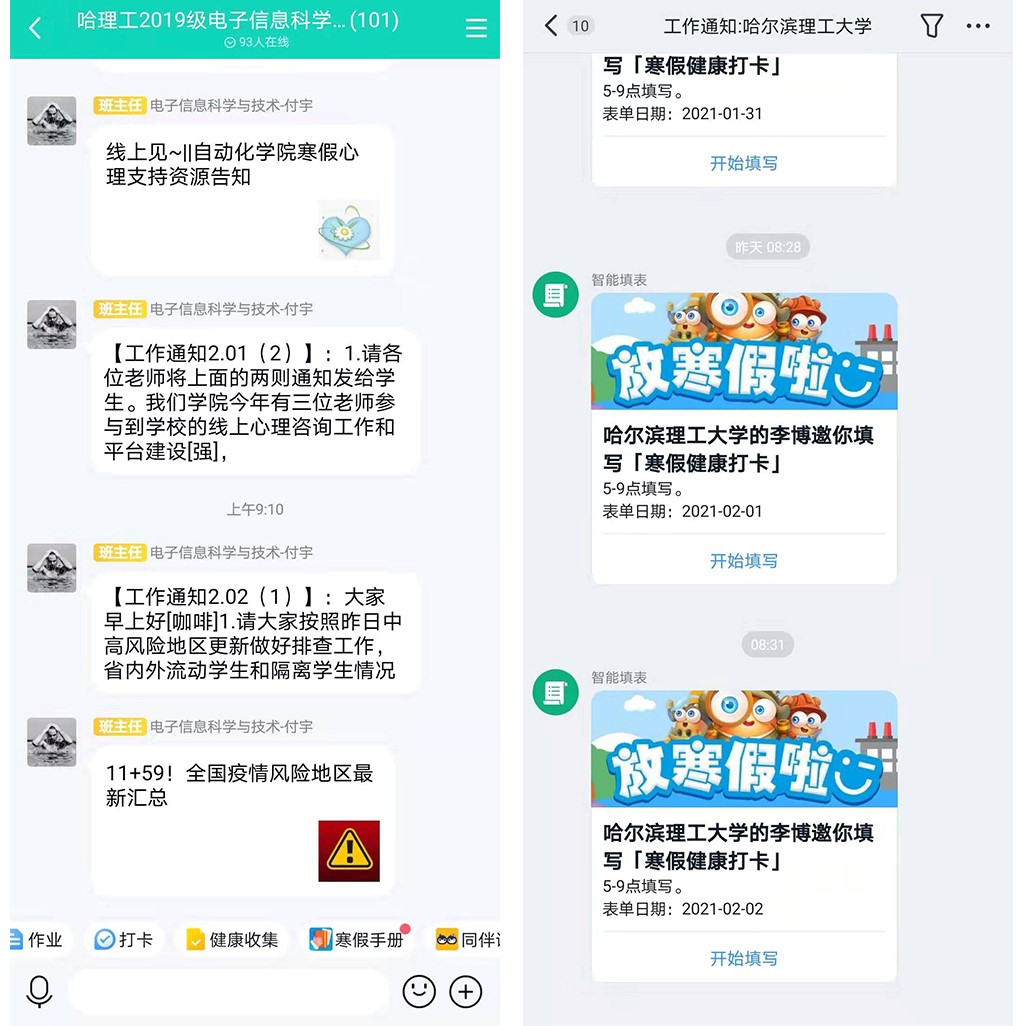 二、做好防控管理。改进方法、优化流程、提高效率,依托学生管理“钉钉”APP进行学生问卷调查、信息普查、健康登记、定位签到等多项举措,全面了解学生返家情况、身心状态和疫情防控认知,实现“点对点”一键发布,实时查看,为科学防疫提供依据。另一方面,学院辅导员积极落实防控举措,开展精准摸排,每日按时、准确上报学生情况,建立中高风险区、个人外出实习、居家或集中隔离、在哈非哈等7类人群动态管理台账,并对各类人群进行有针对性的防疫、安全教育,把防控阻击疫情的要求真正落实落细落到位。