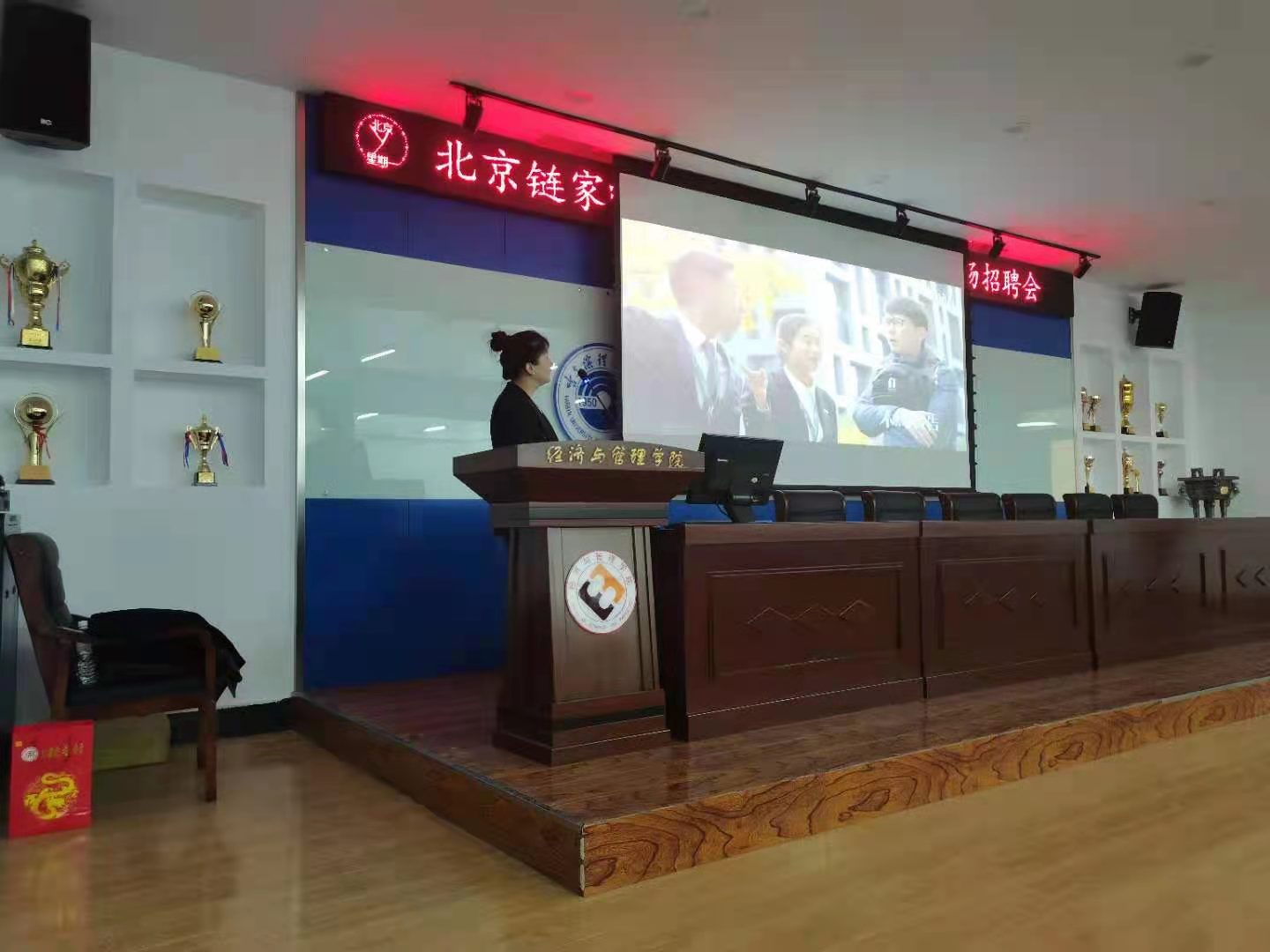 本次招聘会上,北京链家的商圈经理包二平通过PPT展示向在场的同学们详细的介绍了北京链家的历史发展、规模、职业发展方向、招聘计划、福利待遇等。北京链家房地产经纪有限公司成立于2001年,是一家集房产交易服务、资产管理服务为一体以数据驱动的价值链房产服务平台,业务覆盖二手房交易、新房交易、租赁、装修服务等。贝壳找房是链家地产在2018年推出的一个独立的二手房互联网经纪品牌,是为二手房经纪公司搭建一个房源共享平台,实现二手房房源在不同经纪公司之间的流通与合作;其次是为二手房买卖用户提供一个真实的房源展示平台。2020年8月13日,贝壳找房平台在美国上市。对于中国的二手房经纪行业来说,贝壳找房当前可算行业的代表性企业之一。行业看链家,链家看北京。这次招聘主要招聘的岗位经纪人,因为任何岗位都需要从经纪人做起,对专业并没有限制。