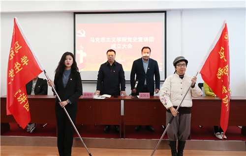 会上,姜部长与马克思主义学院孙明哲院长为宣讲团授旗;与会领导为宣讲团成员颁发聘书;宣讲团第二组组长杨守金教授代表宣讲团成员做表态发言。