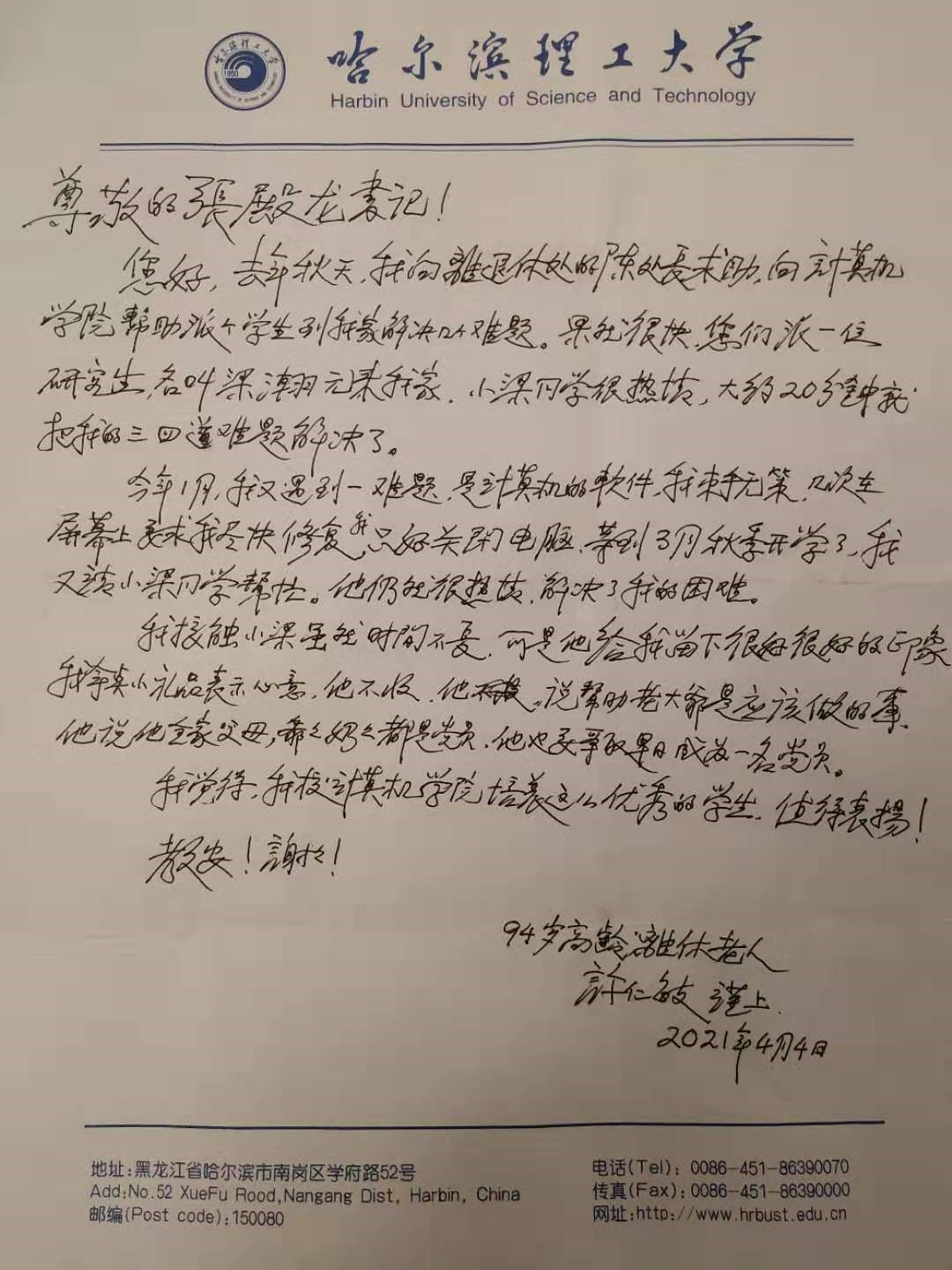 近日,学院收到一封来自必赢官网94岁高龄离退休老教师许仁敏先生的一封感谢信。老人在信中重点描述了我院研究生梁瀚元同学长期以来义务帮助老人解难题、修电脑,办实事的故事。老人由于年纪大了,电脑基础技能和技巧掌握较少,先后出现诸多计算机方面的难题,于是便向学校离退休工作处求助。我院“蓝风铃”志愿服务团队成员梁瀚元同学得知此事之后,主动请缨,第一时间前往老人家里,并运用自己课堂上所学的知识和技能,高效地解决了一直以来困扰老人的难题;之后,老人又遇到了关于计算机软件方面的难题,一度束手无策,老人再次向小梁同学求助,小梁同学在电话里耐心细致地指导老人操作电脑,并热情地赶往老人家里,高质量地帮助老人解决了电脑使用过程中所有出现的问题,并坚持谢绝了老人的酬谢,他说:“这些都是小事情,不值得一提,换别的同学也会这么做的,帮助老人是我应该做的事,我的父母,爷爷奶奶都是党员,我也要以党员的标准要求自己,真心实意为群众解难题、办实事”。小梁同学这种主动请缨,不计回报、无私奉献,全身心投入到为群众办实事的精神得到老人的充分肯定。老人在信中,衷心感谢学校培养了这么优秀的学生,同时也向梁同学表达感谢和敬意。