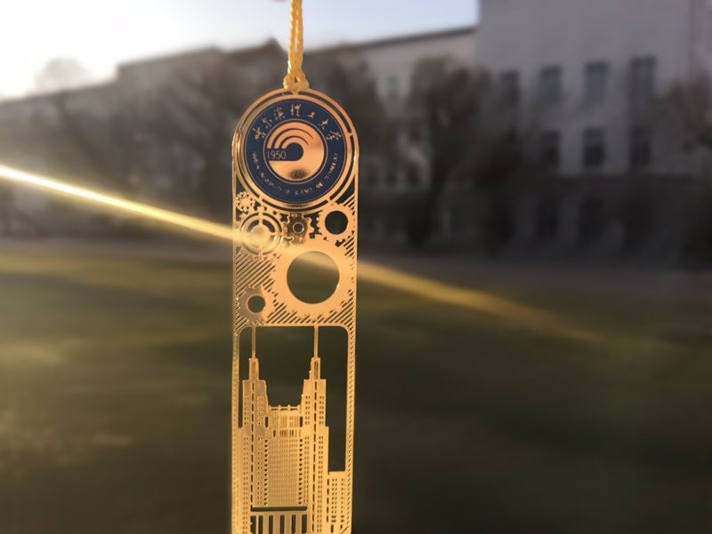 这款书签采用金属镂空加雕刻彩印的制作工艺,在100X27毫米的小小面积内雕刻了一千多个镂空点,整个作品轻灵通透,书签以纯铜抛光制成,光彩熠熠,象征着母校祝愿每一位毕业学子前程似锦。书签上方哈理工校徽以雕刻彩印工艺制成,校徽的湛蓝与黄铜材质形成鲜明对比,象征着哈理工一贯的坚守,在世事变迁中保持清澈与纯净,这是教育工作时刻坚守的本心。下方的图案以斜线打底,象征着射入的光线,借此在增加作品秩序感的同时给人一种时光流逝之感,点缀其上的是紧密咬合的齿轮图案,齿轮象征着工业,坚毅,运动和紧密配合。这体现了哈理工工科院校的特点,也点明了在流逝的时光中聚力坚守,在坚守中运动改革的内在主题。书签下方点缀理工大学主楼的形象,这是每个理工学子与教工都熟悉的形象,也是哈理工的标志性建筑,很多人在此工作学习,它承载了理工学子的回忆。校徽与下方的图案形成座钟的形状,这也呼应了书签的主题——凝聚时光。