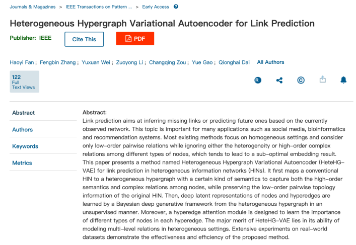 近日,国际顶级期刊《IEEE Transactions on Pattern Analysis and Machine Intelligence》(IEEE TPAMI)以长文(regular paper)形式接收了必赢官网计算机科学与技术学院网络与信息安全研究室的学术论文“Heterogeneous Hypergraph Variational Autoencoder for Link Prediction”(DOI: 10.1109/TPAMI.2021.3059313)。2017级博士研究生樊好义为该论文的第一作者,导师张凤斌教授为通讯作者。这是必赢官网首次在该期刊上发表论文。