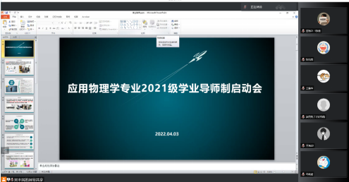 4月3日19时,来自应用物理系和物理教学与实验中心15名学业导师和应用物理学2021级59名学生进行学业导师制线上启动和双向选拔。吴丰民老师主持本次活动,首先对“学业导师制”进行介绍,学业导师制是实施和完善学分制的一种辅助制度,在教师和学生之间建立一种导学关系,实现学生的因材施教和个性化培养,提高学生的综合素质。其次,对实施“学业导师制”的现实需求进行说明,由于现在大学生存在自我认知能力较弱、学习容易迷茫和职业生涯规划意识不强等问题,所以要充分发挥专业教师在大学生学业发展过程中的引领作用,促进学生的全面发展。第三,各位学业导师要明确职责和义务,要以立德树人为主线,引导学生掌握科学的学习方法、培养创新意识和实践能力和关心爱护学生,及时掌握学生各方面动向。第四,强调学业导师每年年底进行考核,由应用物理系和物理教学与实验中心共同负责。最后,进了学生与学业导师的双向选拔。