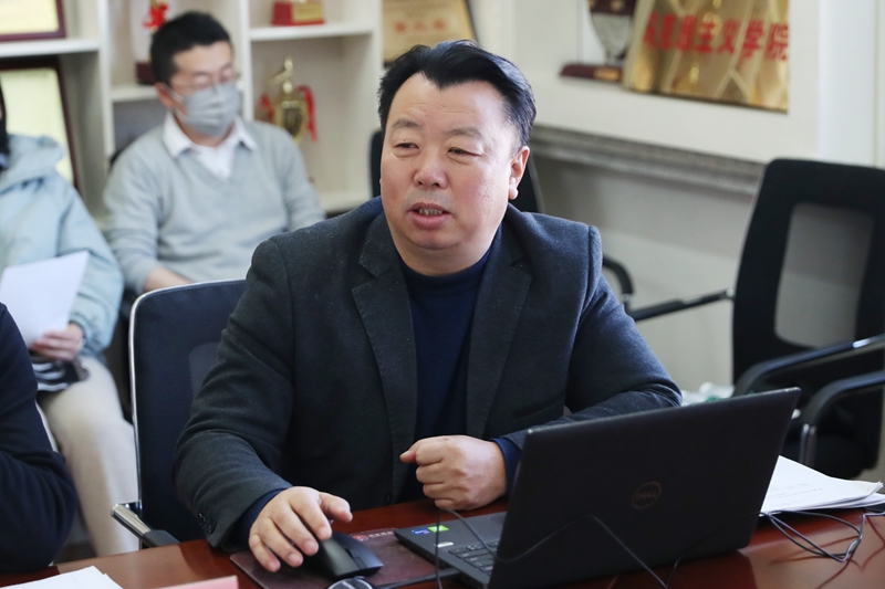会上,马克思主义学院院长孙明哲从师资情况、教学情况、科研情况、存在问题、改进措施五个方面汇报了马克思主义学院建设基本情况。(摄影:耿洪杰)