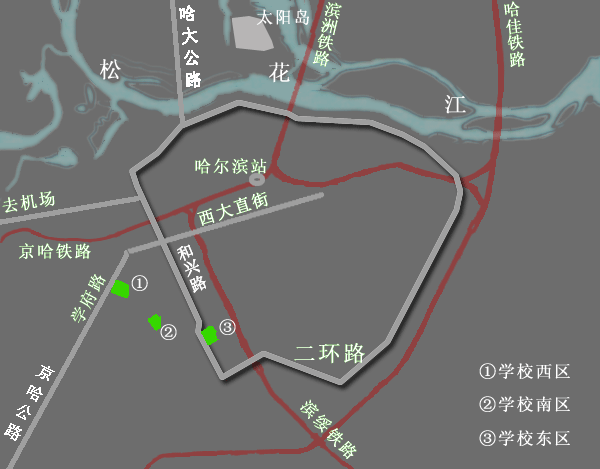 #地铁一号线 哈东站→桦树街(三十八中)→交通学院→太平桥→哈工程大学→烟厂→医大一院(正门)→博物馆(未建成)→哈铁路局→哈工大(西大桥)→西大桥(通达街)→和兴路(清滨公园)→学府路(哈师大附中)→哈理工大学→黑龙江大学(服装城)→医大二院→哈达(机电工程学校)→哈尔滨南站